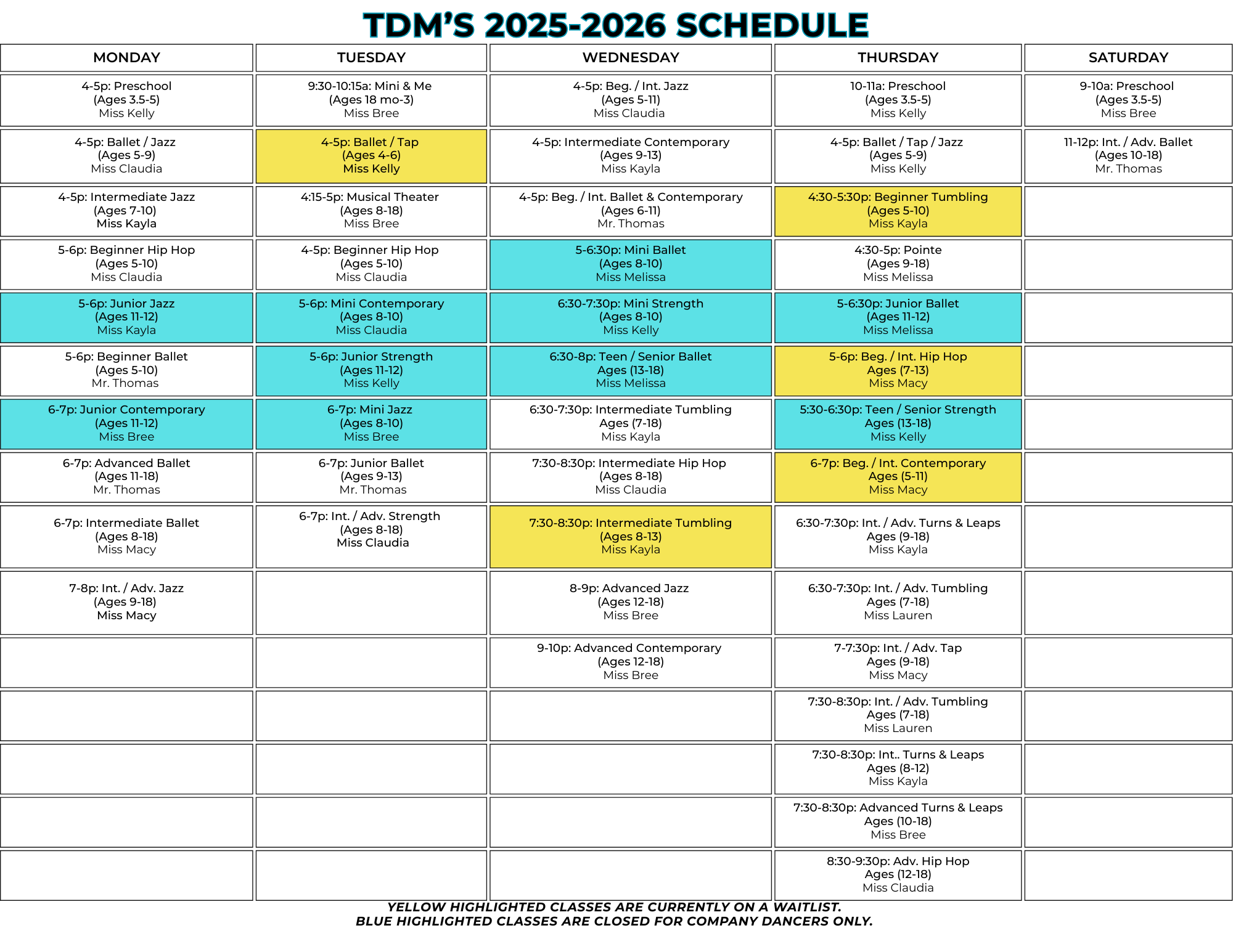 We do offer waitlists for fully booked classes, and will be potentially adding new classes to the schedule based on interest. If your student is waitlisted, be sure to email us at tdmcolorado@gmail.com if you are still interested in the class.